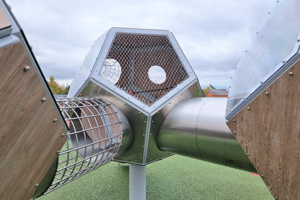 и, с помощью концевых элементов, выполняется установка. Такие панели из тросовой сетки хорошо дополняют технократичный облик игрового комплекса, оставляют внутри игрового пространства много света и надежно защищают открытые проемы